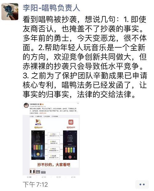 唱鸭负责人李阳在朋友圈回应称,看到唱鸭被抄袭,想说几句:1、即使友商否认,也掩盖不了抄袭的事实。多年前的勇士,今天变恶龙,很不体面。2、帮助年轻人玩音乐是一个全新的方向,欢迎竞争创新共同做大,但赤裸裸的抄袭只会导致低水平竞争。3.、之前为了保护团队辛勤成果已申请核心专利,唱鸭法务已经发函了,让事实的归事实,法律的交给法律。