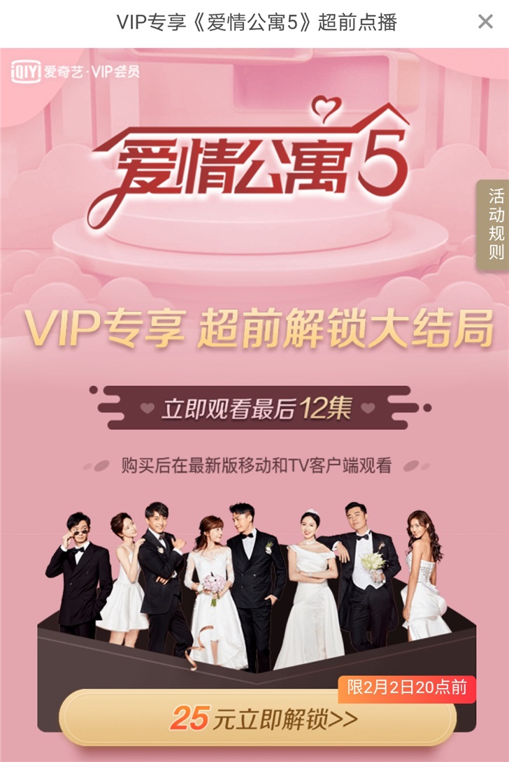 爱奇艺表示,在活动期间,《爱情公寓5》仍会按照当前播出策略更新,即每周日至周二20:00各更新2集,会员抢先看一周(6集),对于希望以更快速度提前观看剧情发展的爱奇艺VIP会员,1月28日20:00起,可享超前点播服务,直通大结局。
