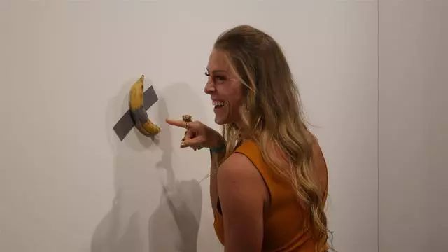 该作品题为《喜剧演员》(Comedian),出自意大利现代艺术家莫瑞吉奥·卡特兰 (Maurizio Cattelan)之手。香蕉来自迈阿密当地的一家超市,然后用一块胶带将其粘贴在墙上。